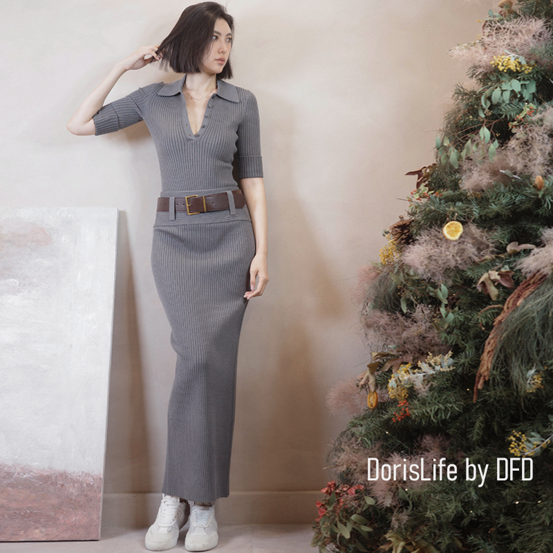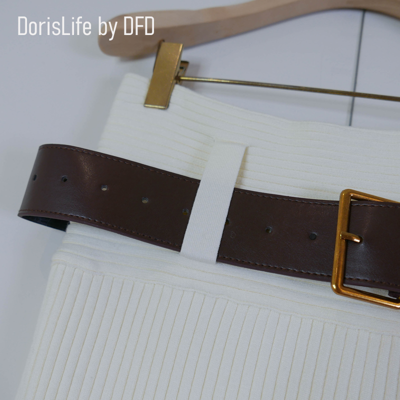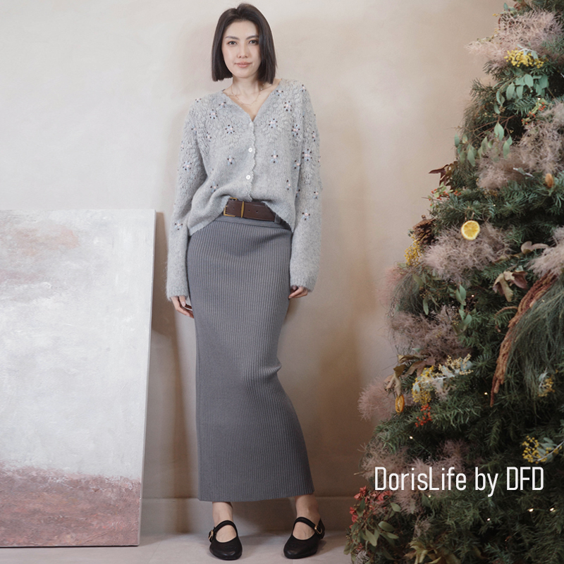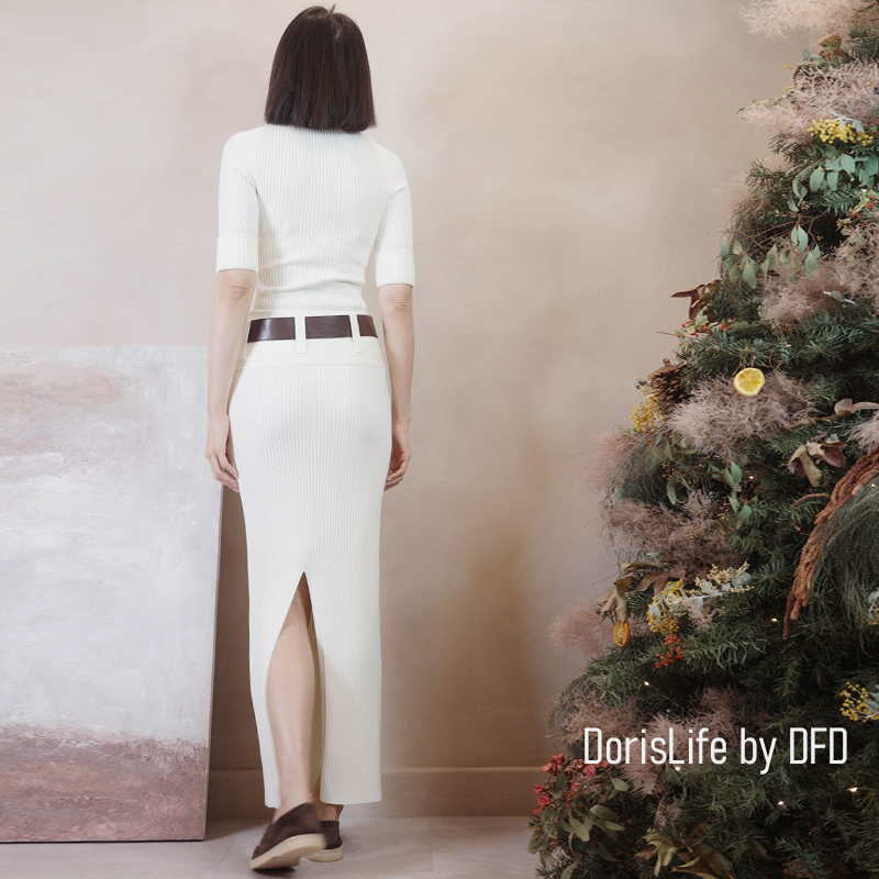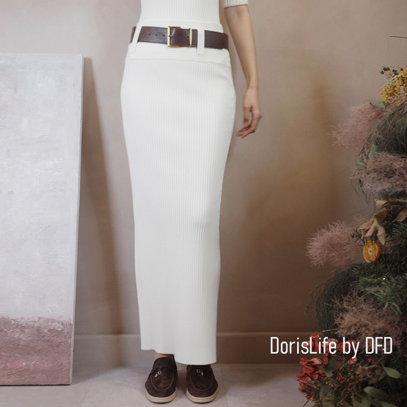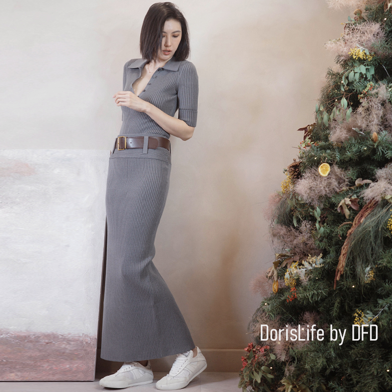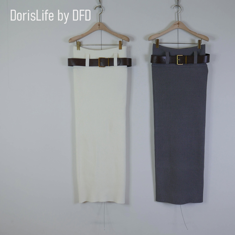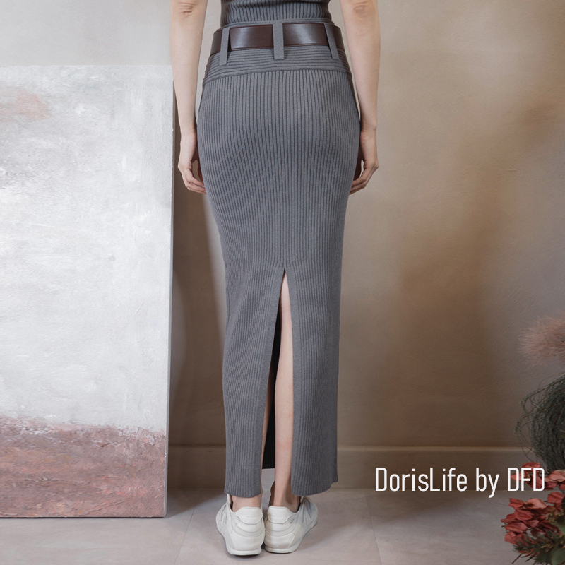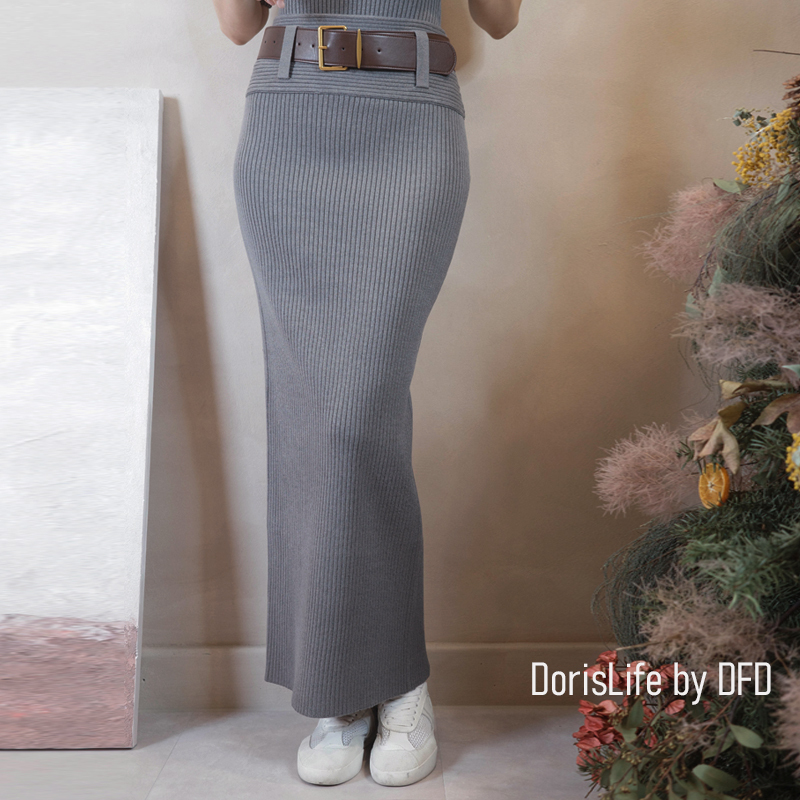 ♣ 6T21 針織螺紋後開岔長裙(附腰帶) 灰色 | 奶油 NT.2680