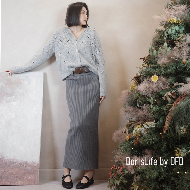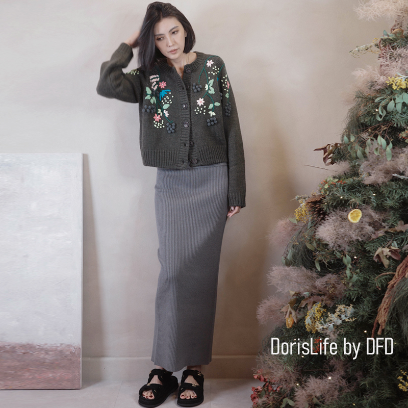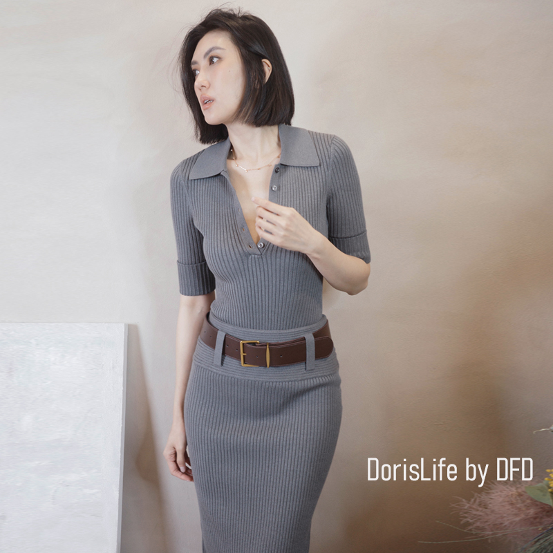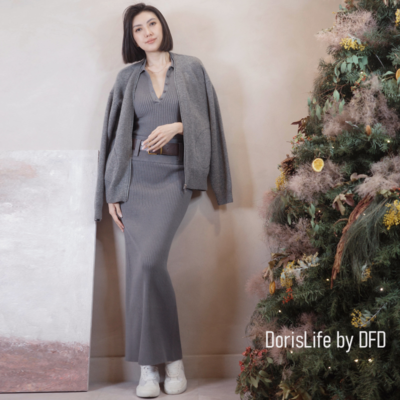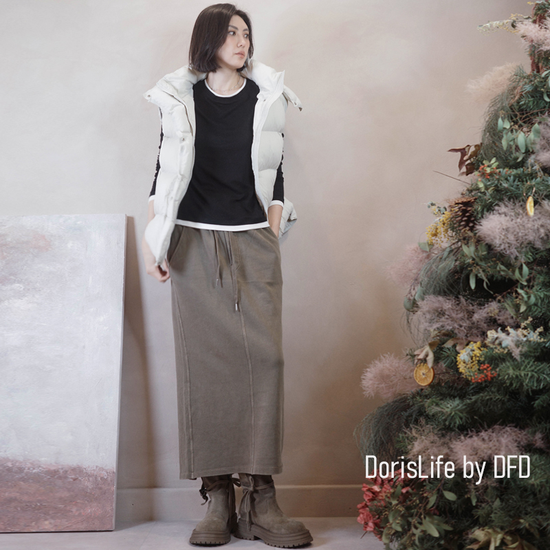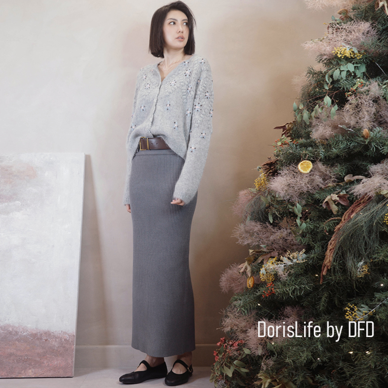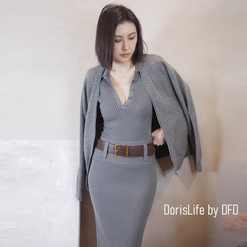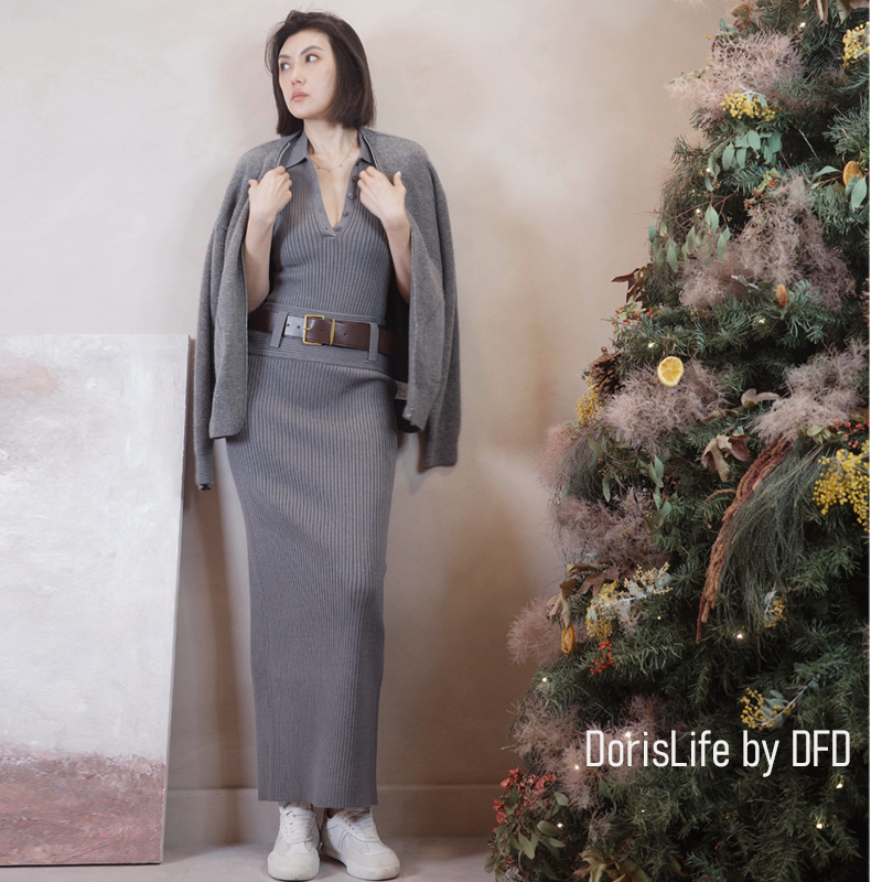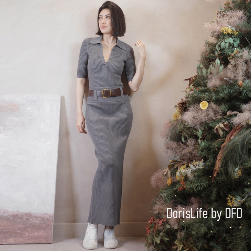 ♣ 6T21 針織螺紋後開岔長裙(附腰帶) 灰色 | 奶油 NT.2680