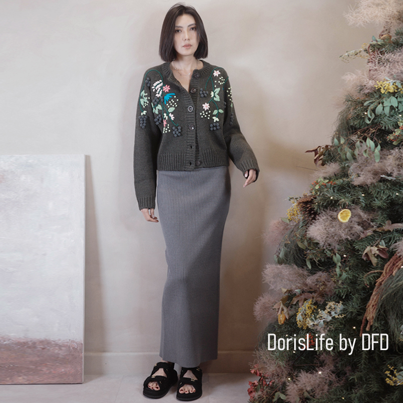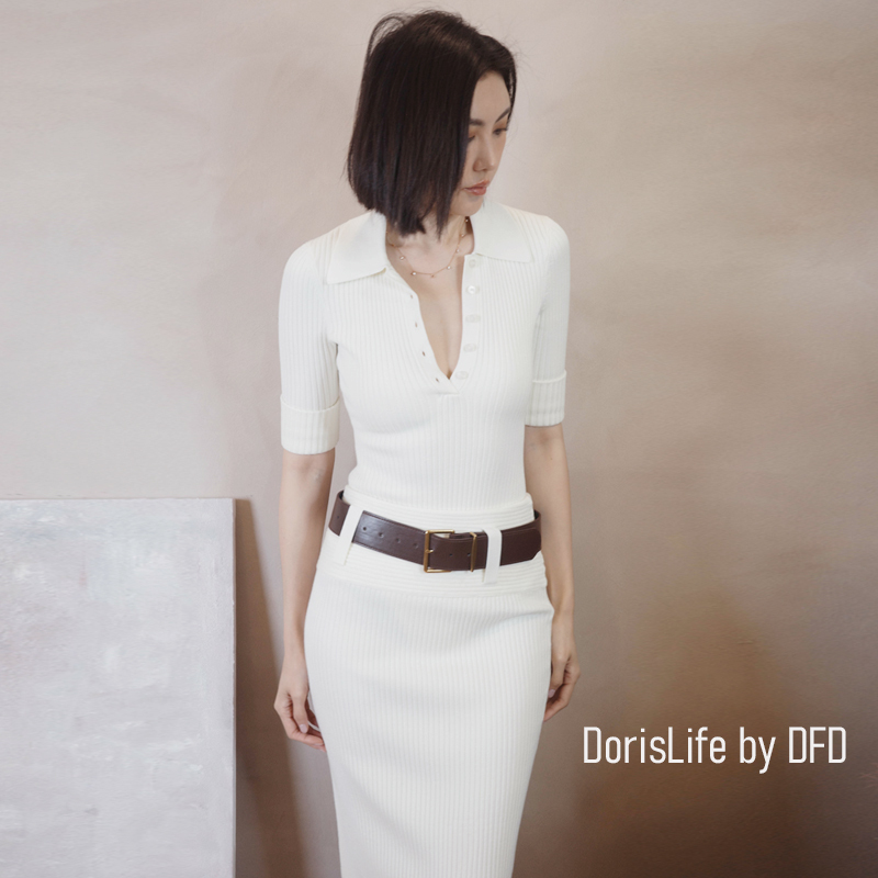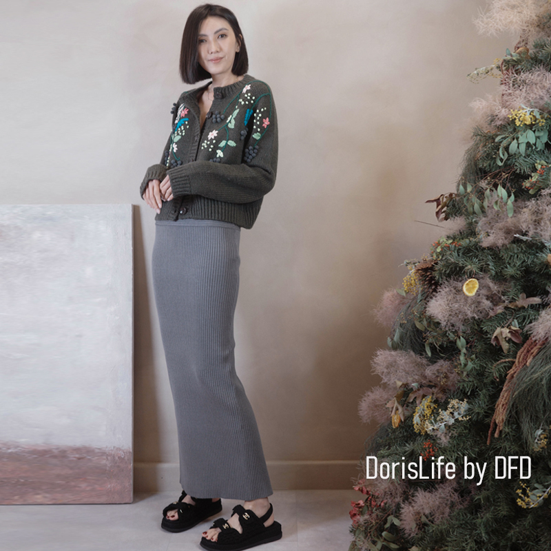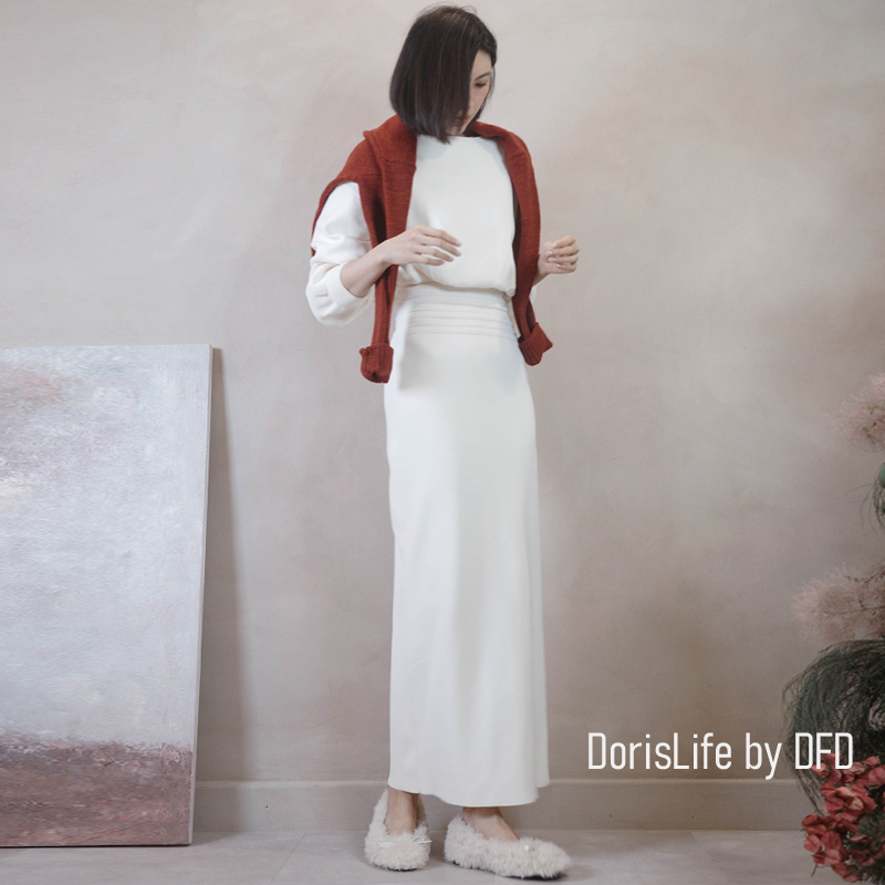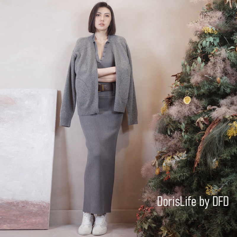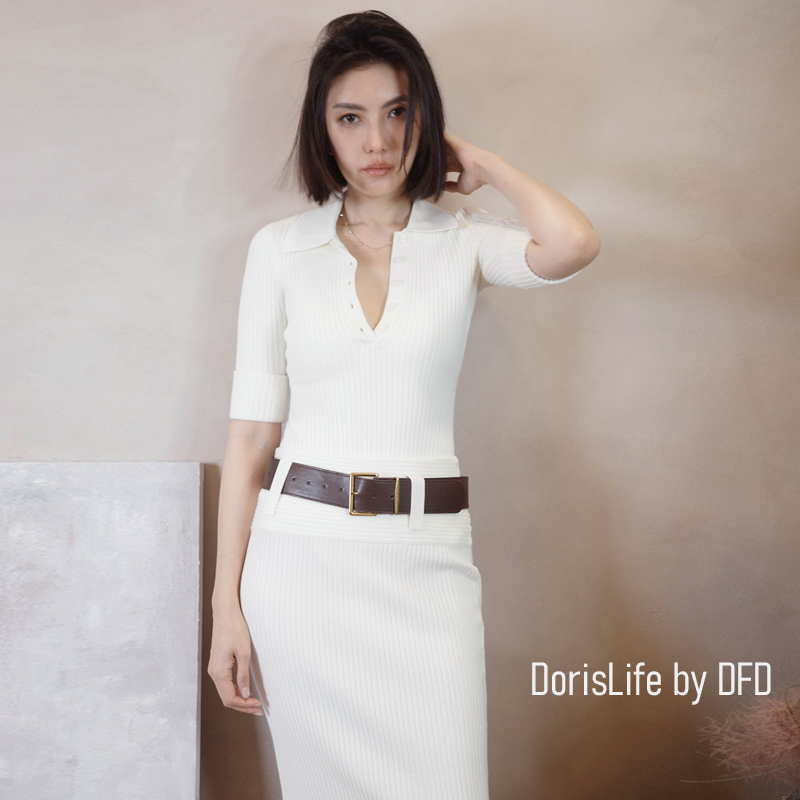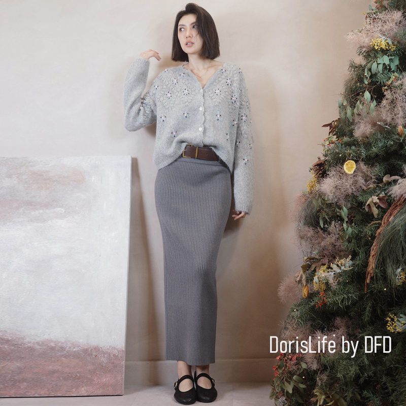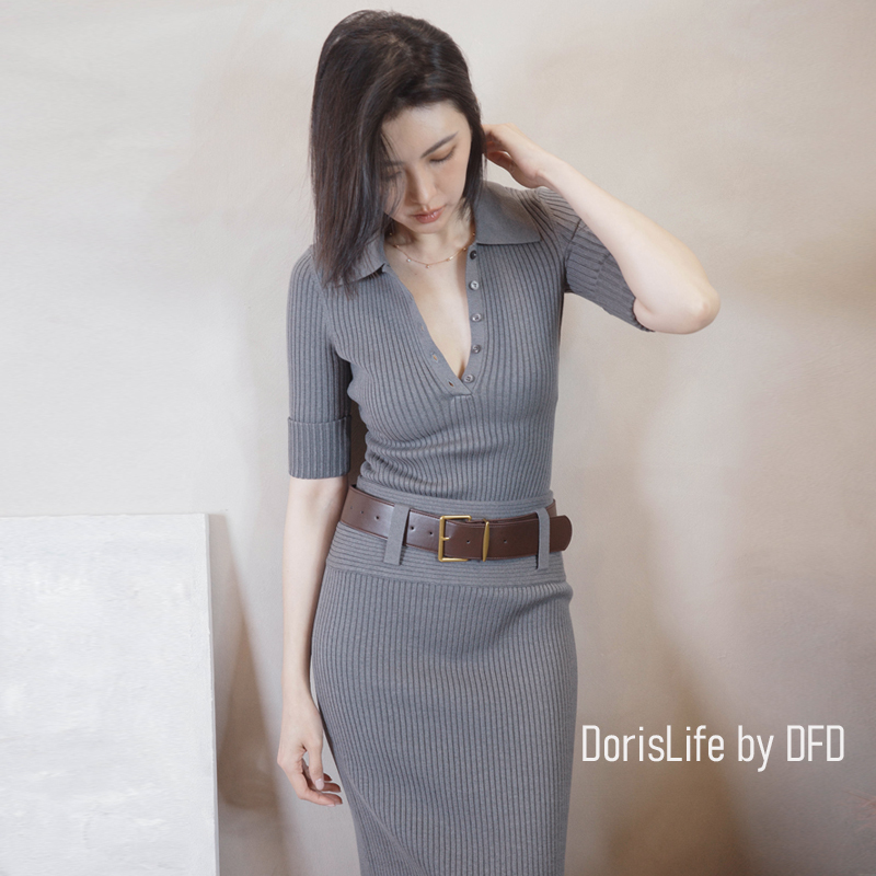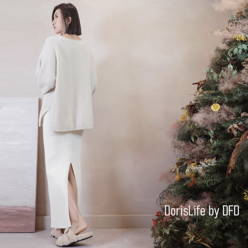 ♣ 6T21 針織螺紋後開岔長裙(附腰帶) 灰色 | 奶油 NT.2680